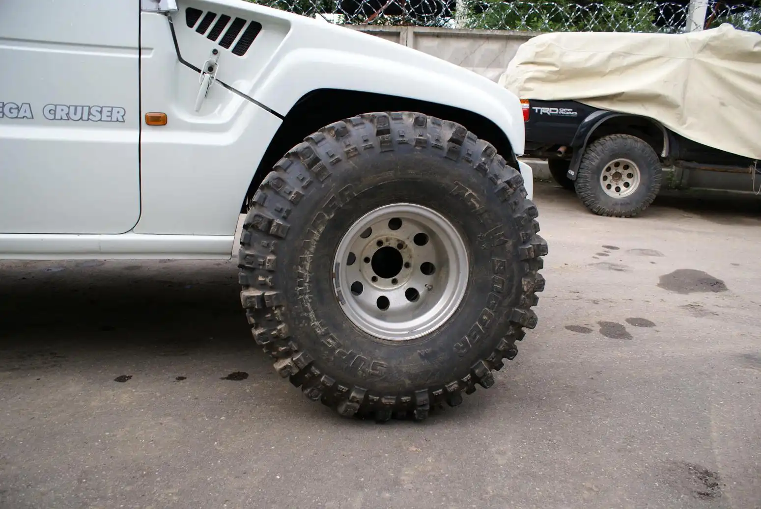 Не иначе с целью усложнения жизни владельцев Mega Cruiser штатные покрышки на автомобиль отличаются хитрой размерностью 37х12.5 радиуса 17.5. Поэтому проще заказать изготовление колесных дисков, скажем, на 18 дюймов (меньше нельзя из-за бортовых редукторов), чем найти грязевую резину такой размерности.