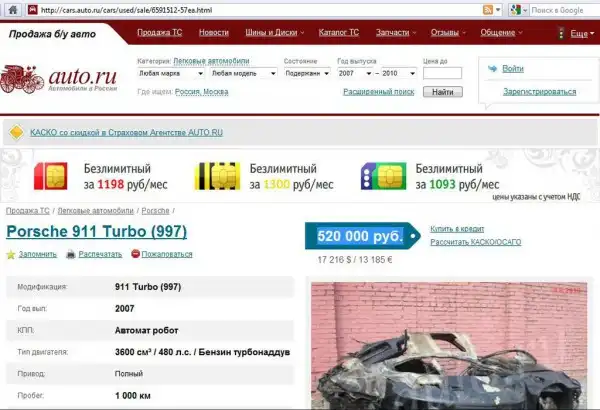 Кому порша 911 Turbo 1997 года почти на халяву ? Пробег всего 1000 км , почти новый. И всего за сущие копейки за 520 тысячи рублей. Правда есть один маленький недостаток…