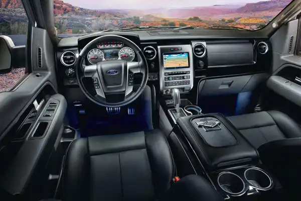Салон внедорожника обтянули дорогой черной кожей, в которую местами интегрировали натуральную змеиную кожу, ее, к примеру, можно встретить на подлокотнике, сиденьях и рулевом колесе. Торпеду окрасили в черный цвет и разнообразили это обилие темного тона синей светодиодной подсветкой. Матовые алюминиевые вставки и большая эмблема Harley-Davidson на крышке ящика, он же выполняет роль переднего подлокотника, дополнили новый стиль внутреннего убранства. Уже в стандартной комплектации пикапа имеется 4,2-дюймовый ЖК-дисплей, голосовая навигационная система, люк с электроприводом, камера заднего вида, подогрев сидений, система дистанционного запуска, регулируемые по высоте педали и преобразователь электрического тока.