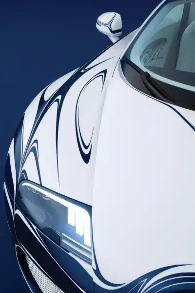 Надо полагать, главная цель создания Veyron Grand Sport L'Or Blanc – немножко «попиарить» немецкого производителя фарфора KPM. Тем не менее, машина получилась очень интересная. Прежде всего, даже не использованием в отделке фарфора, а окраской. На первый взгляд, да и на второй, и на третий, может показаться, что поверхность кузова L'Or Blanc абсолютно зеркальна. Но это иллюзия: машина окрашена обычной белой и синей краской. Линии повторяют форму отражений, которые 3D-моделлеры используют для проверки правильности построения формы. Дизайнеры Bugatti говорят, что такие же отражения были и на белоснежном Veyron, стоящем в фирменной студии. Каждое отражение они обрисовали и откорректировали с помощью тейпа (специальная липкая лента, используемая дизайнерами), потом по получившимся контурам маляры нанесли синюю краску.