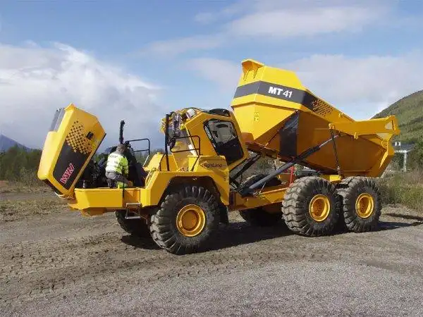 Сочлененный самосвал – это самоходная машина, имеющая специализированные колесные шасси и колесную формулу 6х6, а иногда 4х4. Если двухосные модели обладают грузоподъемность до 25 тонн, то трехосные – до 50 тонн. Основная отличительная особенность данного вида самосвалов - это шарнирно-сочленённая рама. Эта рама состоит из двух однотипных полурам, которые соединены шарнирным устройством. Полурамы способны поворачиваться друг относительно друга вокруг вертикального и горизонтального шарниров. Такая конструкция обеспечивает прекрасную маневренность и повышенную проходимость. Также к одному из важных качеств шарнирно сочленённого самосвала можно отнести высокие скоростные характеристики.