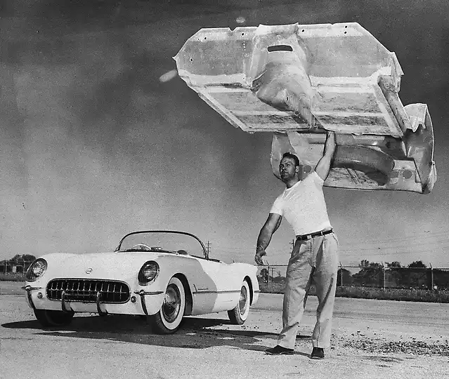 8. Норберт Шемански держит низ кузова Chevrolet Corvette на этой фотографии, сделанной в сентябре 1953 года. На заднем плане виден Chevrolet Corvette.
