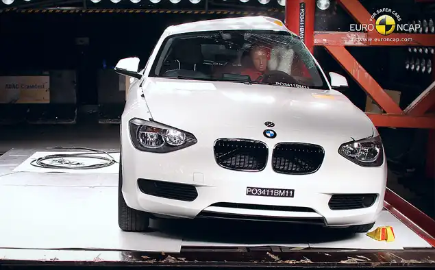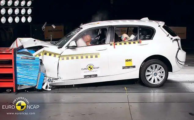 «Копейка» BMW во фронтальных краш-тестах также показала почти максимально возможный результат (15,4 балла), однако при боковом ударе о столб давление на грудную клетку водителя оказалось слишком высоким и защита была признана слабой (оценка 2 по пятибальной шкале).