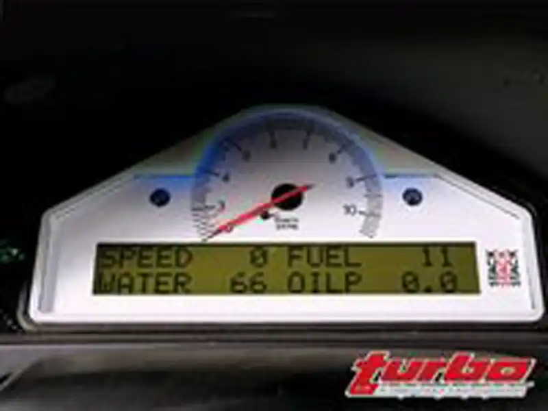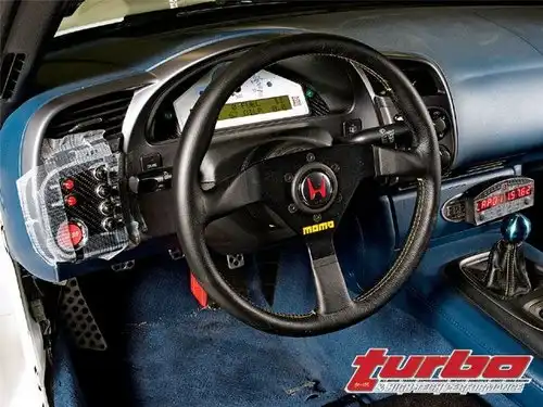 В салоне все сугубо функционально. Карбоновые ковши Spoon и ремни Takata крепко держат седоков, за безопасность отвечает четырехточечный каркас Cusco. Стоковый руль заменили моделью Veloce от Momo, а штатную приборную панель — более подходящей случаю Stack ST8100. Титановая ручка переключения скоростей T1R и карбоновый корпус салонного зеркала заднего вида Zoom изящно дополняют интерьер.