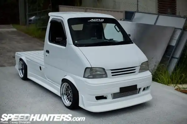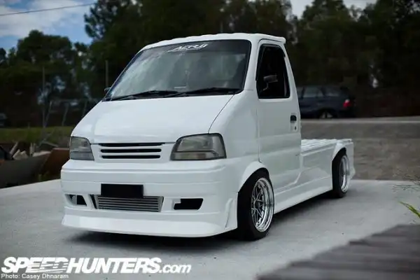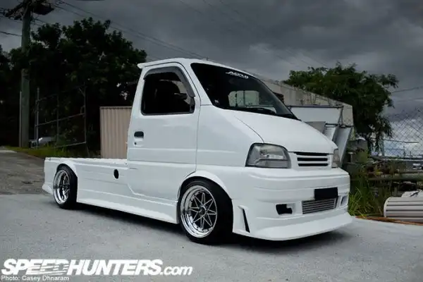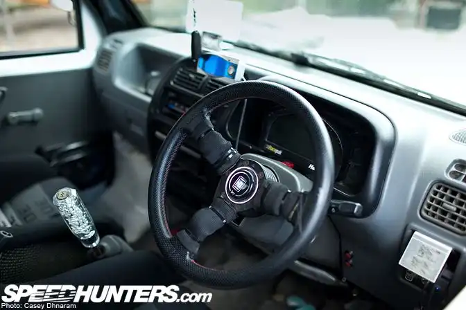 Этот внутри японский пикап Suzuki KEI оборудован двигателем 1,3 литра и мощностью в 82 л.с. Японцы, как известно, большие любители тюнинга, вот и не удержались они от того, чтобы не затюнить этот пикап.