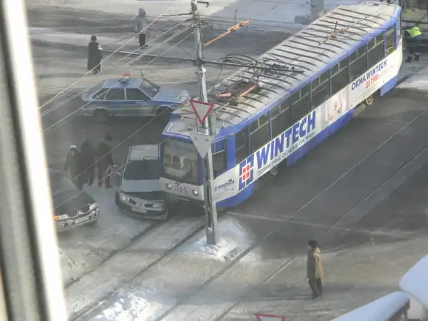 Судя по всему владелец вышеуказанного транспортного средства решил проскочить перекресток на только что загоревшийся красный свет. Трамвай же уже начал движение на свой сигнал светофора. А так как трамвай не бугатти и за 2.5 секунда не останавливается, то злосчастный французский автопром подмяло, затянуло под колесо и протащило метров на 4 от точки соприкосновения.