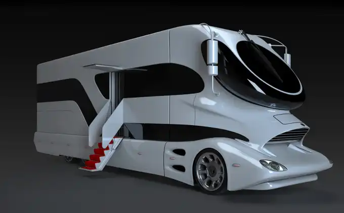 EleMMent PALAZZO - это действительно целый дом со всеми удобствами длинной в 12 метров. 20 метров отдано под зону отдыха Sky Lounge, с баром, подогревом пола и массажными креслами. Верхний этаж может увеличиватся на 80% за счет выдвижного механизма со одной стороны автодома. Стоимость от $3 000 000.