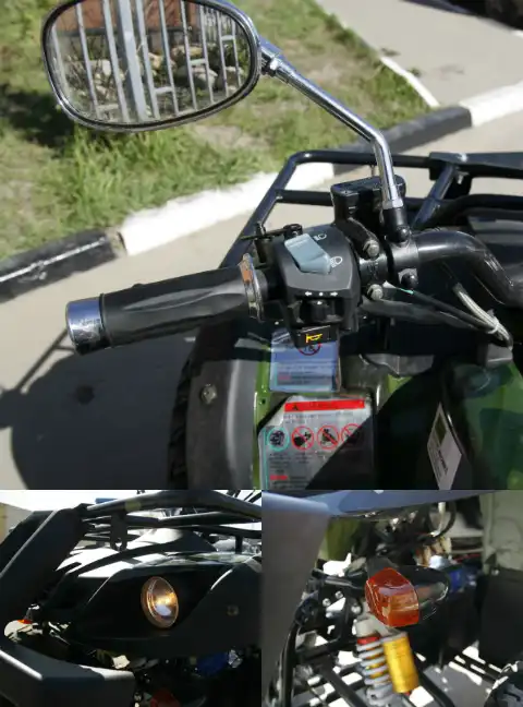 Квадрик заводится ключом: один поворот вправо до щелчка. Газ — поворот правой рукоятки к себе. Красной кнопкой переключается режим движения вперёд-назад.