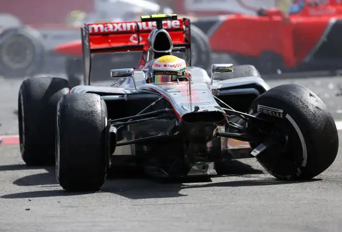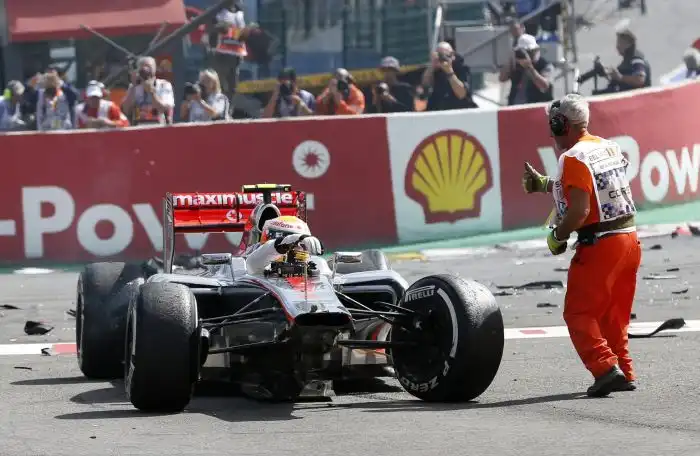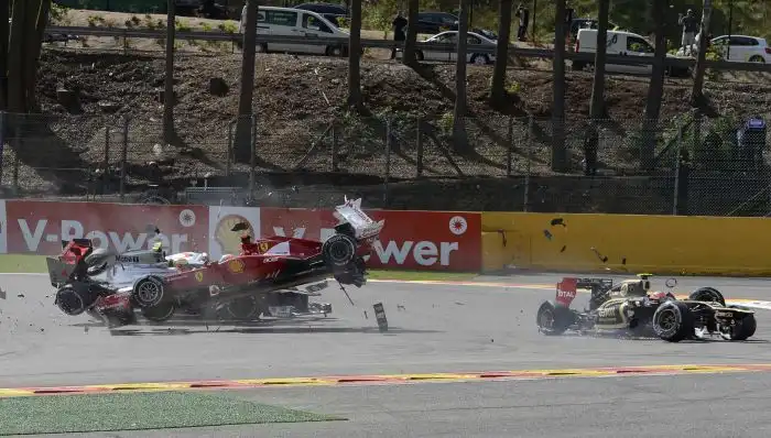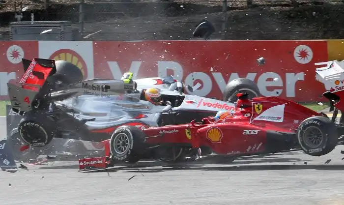 Французский гонщик Ромен Грожан на своем болиде Lotus стал виновником масштабной аварии на гонках «Формула-1». Грожан столкнулся с британцем Льюисом Хэмилтоном, за что был оштрафован на 50 тыс. евро и был дисквалифицирован из команды Lotus на следующий этап чемпионата в Италии. Давайте посмотрим на масштаб этой аварии на гоночном треке «Формула-1».