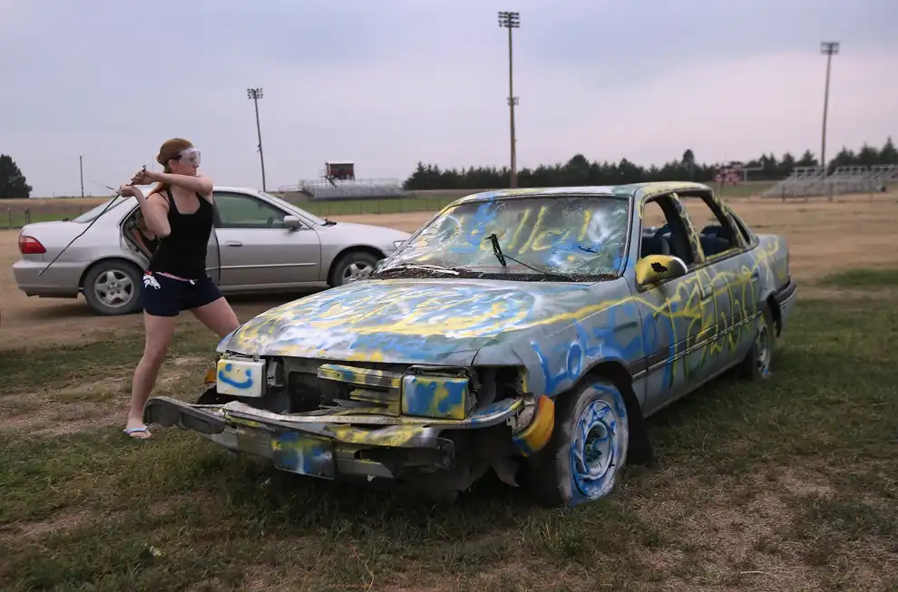 17-летняя Кэти Бекер разбивает лобовое стекло во время так называемого ритуала «разбей машину» перед футбольным матчем между старшими школами в Логане, Канзас. Ученики небольшого городка пишут на старом автомобиле имя название команды соперника, а затем разбивают машину перед самым матчем.