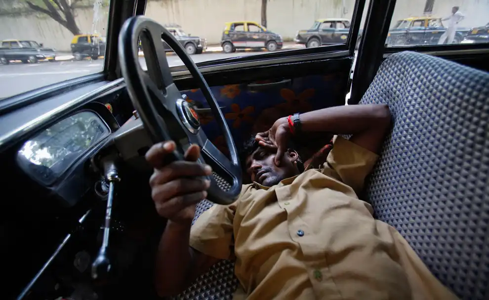 Таксист в Мумбаи спит, не убирая руки с руля. Правительство Индии запретило работать таксистами людям младше 25 лет.