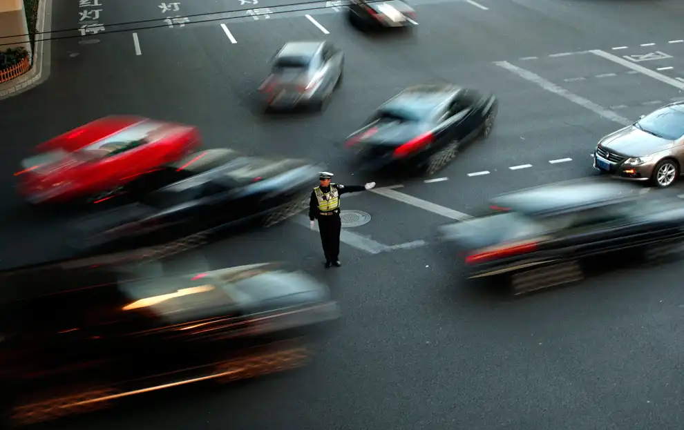 Регулировщик управляет движением в центре Шанхая. В 2010 году в Китае произошло 3,9 миллиона аварий, в которых погибло 65 225 человек и было ранено еще 254 075. В 2009 году в США произошло 30 797 аварий с летальным исходом.