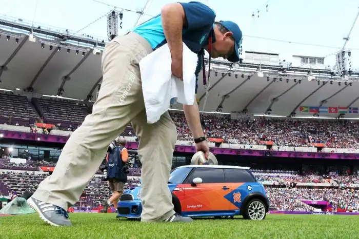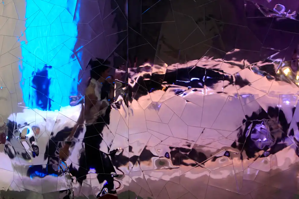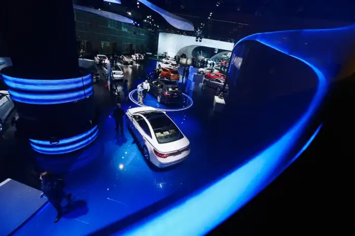 Отражение автомобиля в стене во время подготовки к Московскому автосалону, где было представлено более 100 компаний.