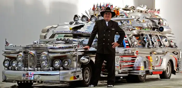 Антти Рако со своим самодельным «Финнджетом» на автосалоне в Эссене, Германия. Автомобиль имеет 8 колес, 10 сидений, весит 3,4 тонны и стоит около миллиона долларов.