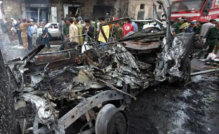 Последствия взрыва бомбы в автомобиле в Сане, Йемен. Министр обороны страны избежал взрыва, в котором погибли 12 человек.
