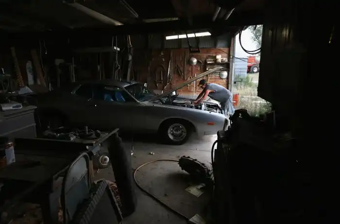 19-летний Чарли Бекер проверяет двигатель своего восстановленного «Dodge Charger» 1973 г.в. в Логане, Канзас.