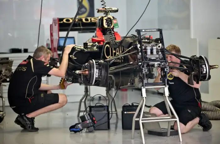 Инженеры финсокго пилота Кими Райкконена собирают автомобиль перед Индийским Гран-При Формулы 1 на окраине Нью-Дели.