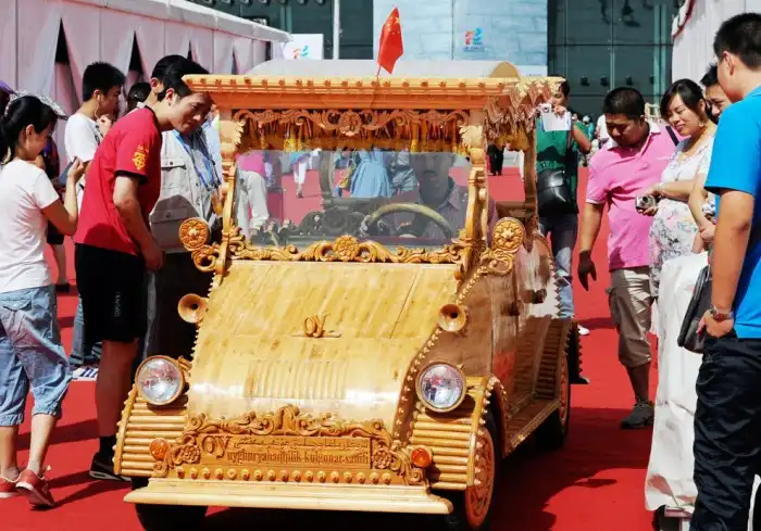 Деревянный электромобиль на выставке в Урумчи, Китай. Мужчина, сделавший это чудо, потратил на него полгода и около 7880 долларов. Электромобиль способен проехать 100-130 км на одном заряде, а его максимальная скорость – 50 км/час.