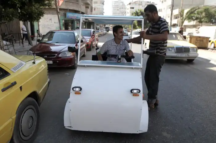 Таксист Мунтер-аль-Касас на электромобиле на улицах Газы. Касас делал этот автомобиль несколько месяцев на крыше своего дома в Газе.