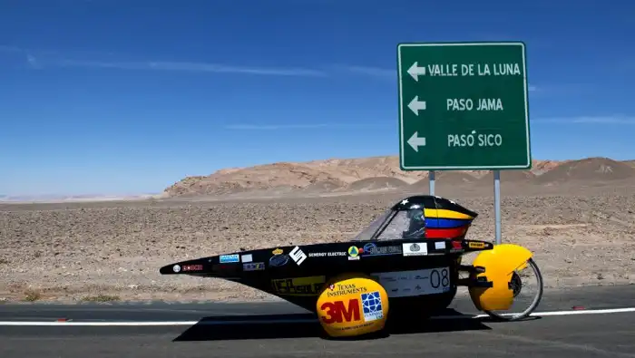 Венесуэльская команда «USB Solar» на второй стадии гонки на автомобилях, заряженных от солнечного света, недалеко от Сан-Педро-де-Атакама. В гонке, которая проходит три дня на 1300 км, приняли участие 15 команд из 4 стран.