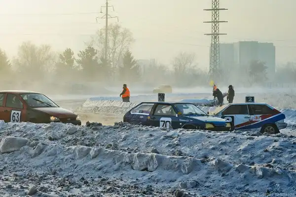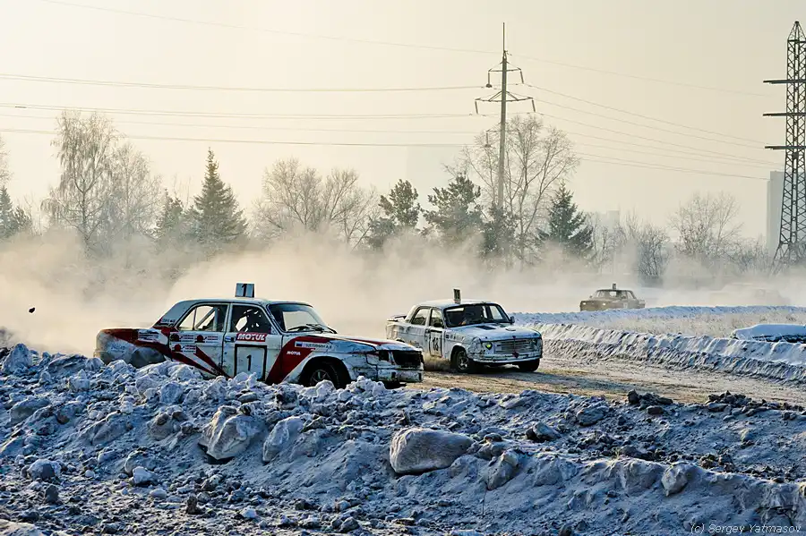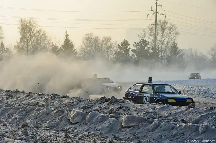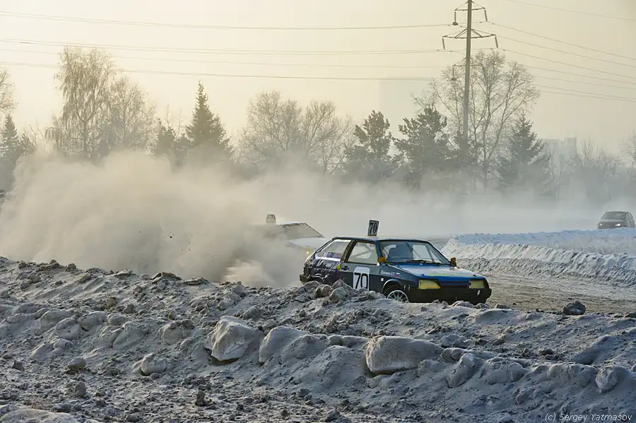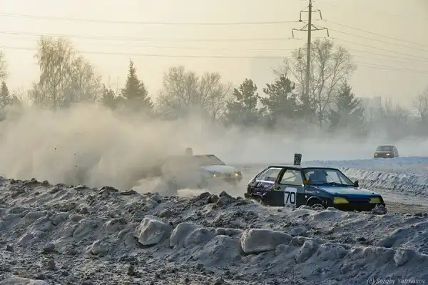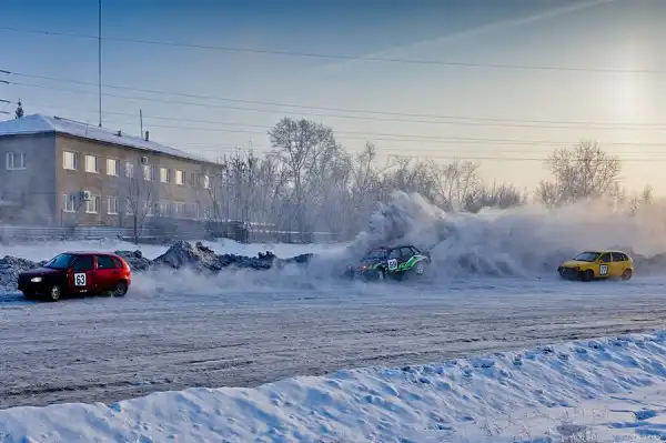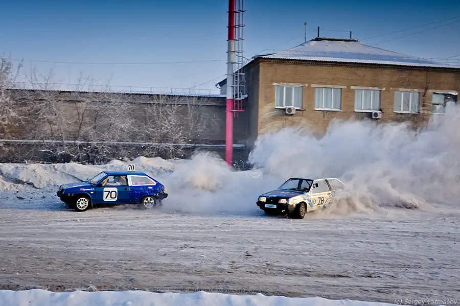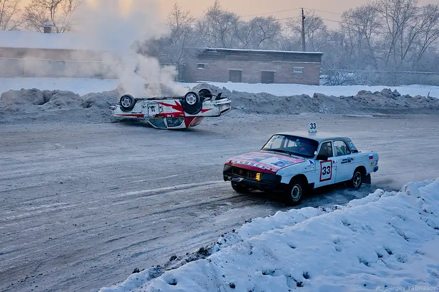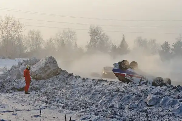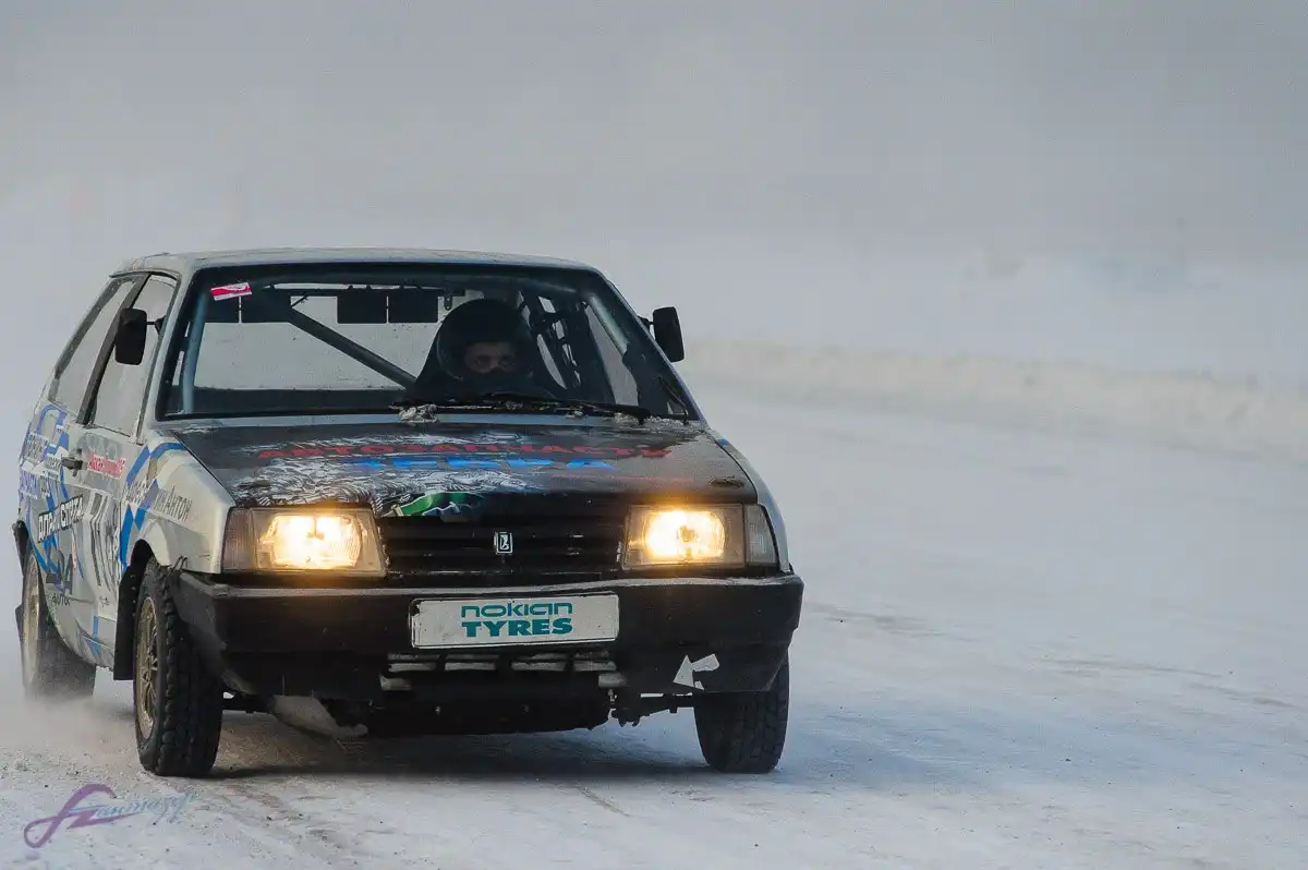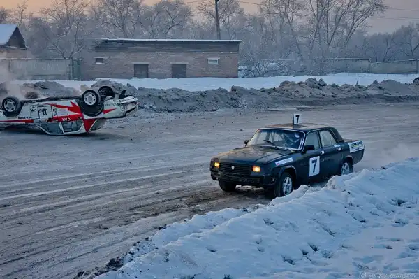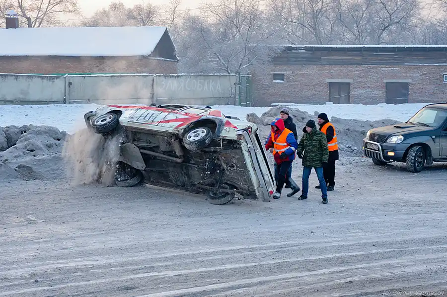 По регламенту соревнований автомобили должны были участвовать на нешипованной резине. поэтому было достаточно много разворотов, переворотов, вылетов.