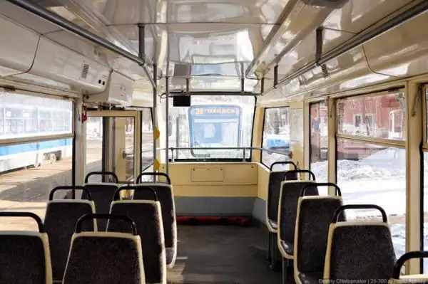 5. В вагоне 16 посадочных мест (как в маршрутном такси), широкий центральный проход и задняя накопительная зона. По мнению инженеров, в данном трамвае исчезнет проблема распределения пассажиров — вход будет осуществляться через переднюю дверь, выход — через заднюю. Турникеты в новых трамваях устанавливаться не будут.