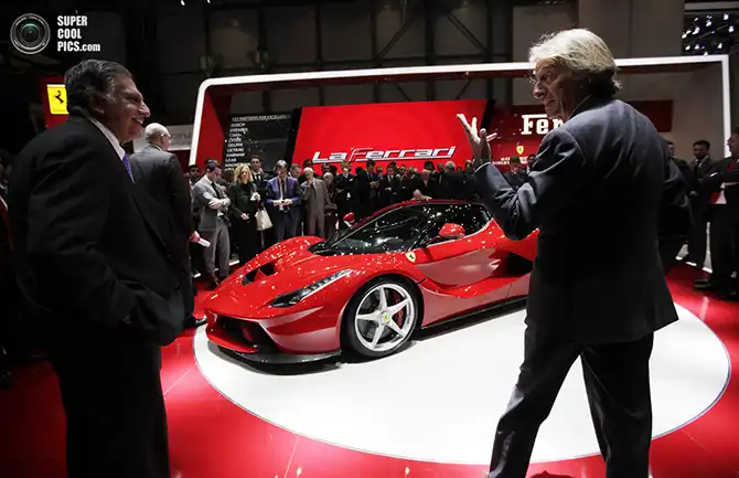 Генеральный директор Fiat Серджио Маркионне (Sergio Marchionne) машет рукой, усевшись на капот Ferrari LaFerrari вместе с генеральным директором Ferrari Лукой Кордеро ди Монтедземоло (Luca Cordero di Montezemolo).