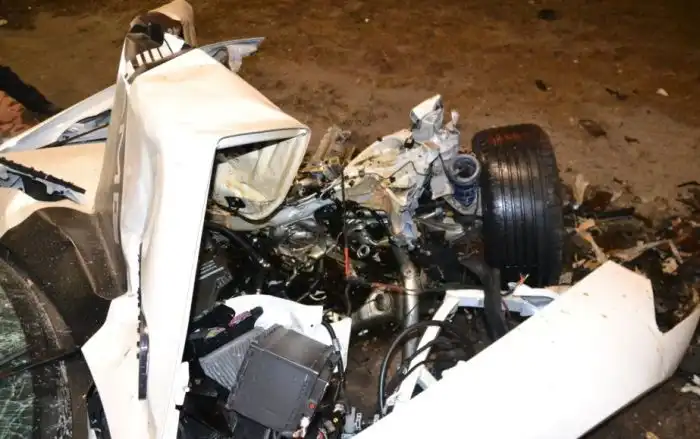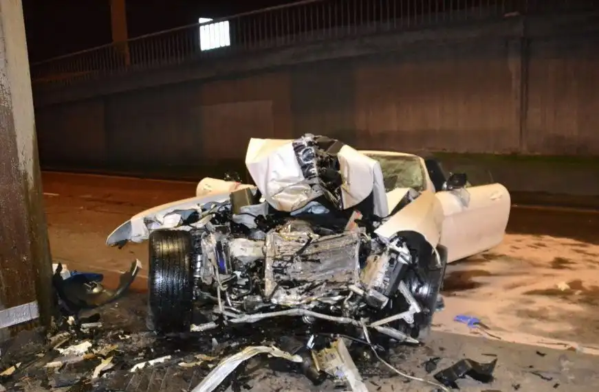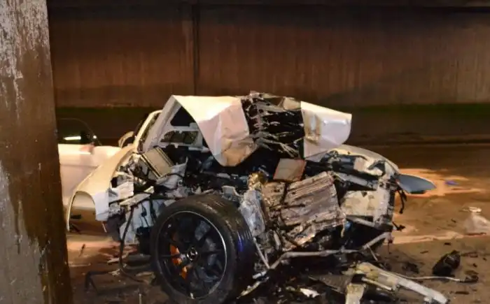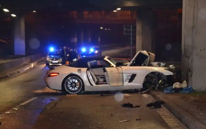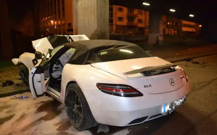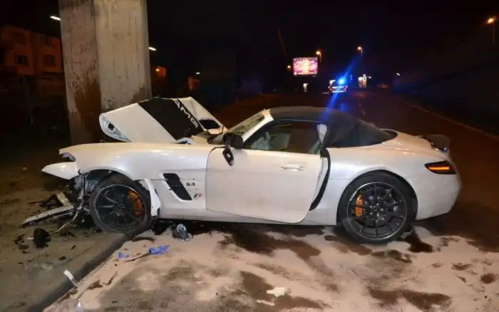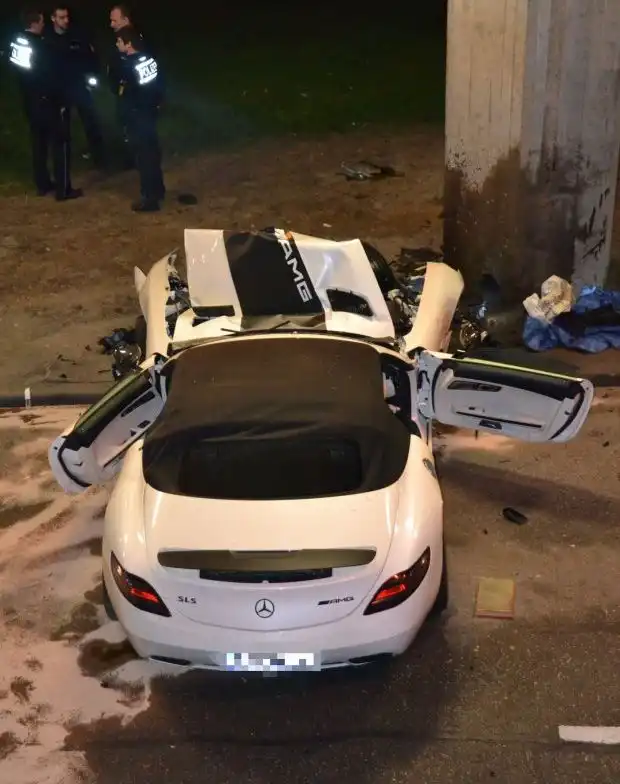 Груда покореженного металла, которую вы сейчас видите на фото, не так давно гордо носила название одного из лучших в мире суперкаров - Mercedes-Benz SLS AMG Roadster. К сожалению, на данный момент и водитель и пассажир находятся в реанимации, поэтому о причине столь серьезного ДТП пока можно только гадать. Прибывшая на место аварии полиция сразу заявила, что авария произошла из-за серьезного превышения скоростного режима водителем этого Mercedes-Benz SLS AMG Roadster, что привело к потере управления и мощному удару в опору моста.