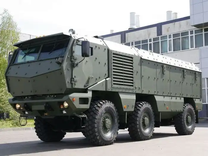 Артиллерийский тягач «КАМАЗ»-6350 с бронированной кабиной и обитаемым отсеком для расчёта.