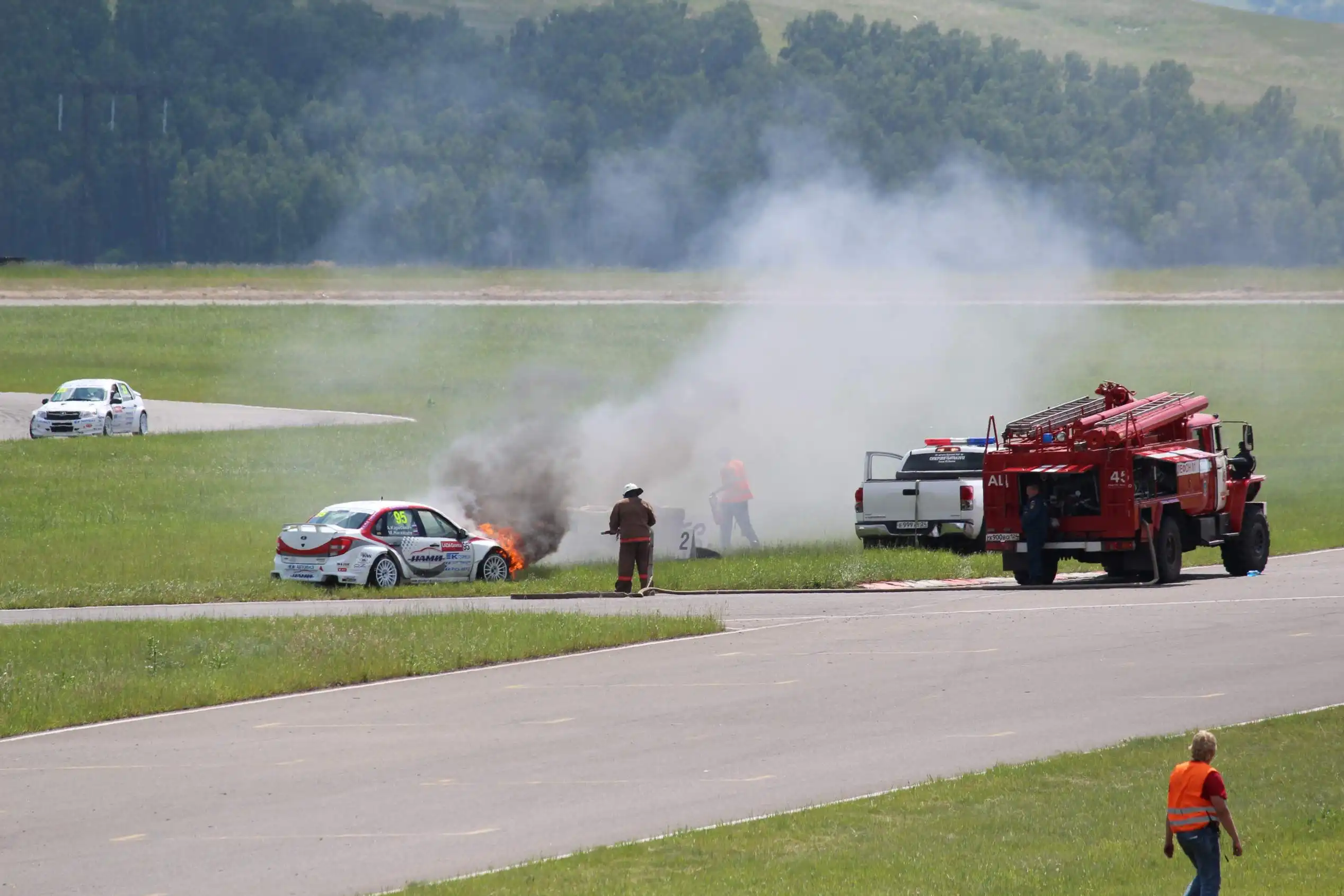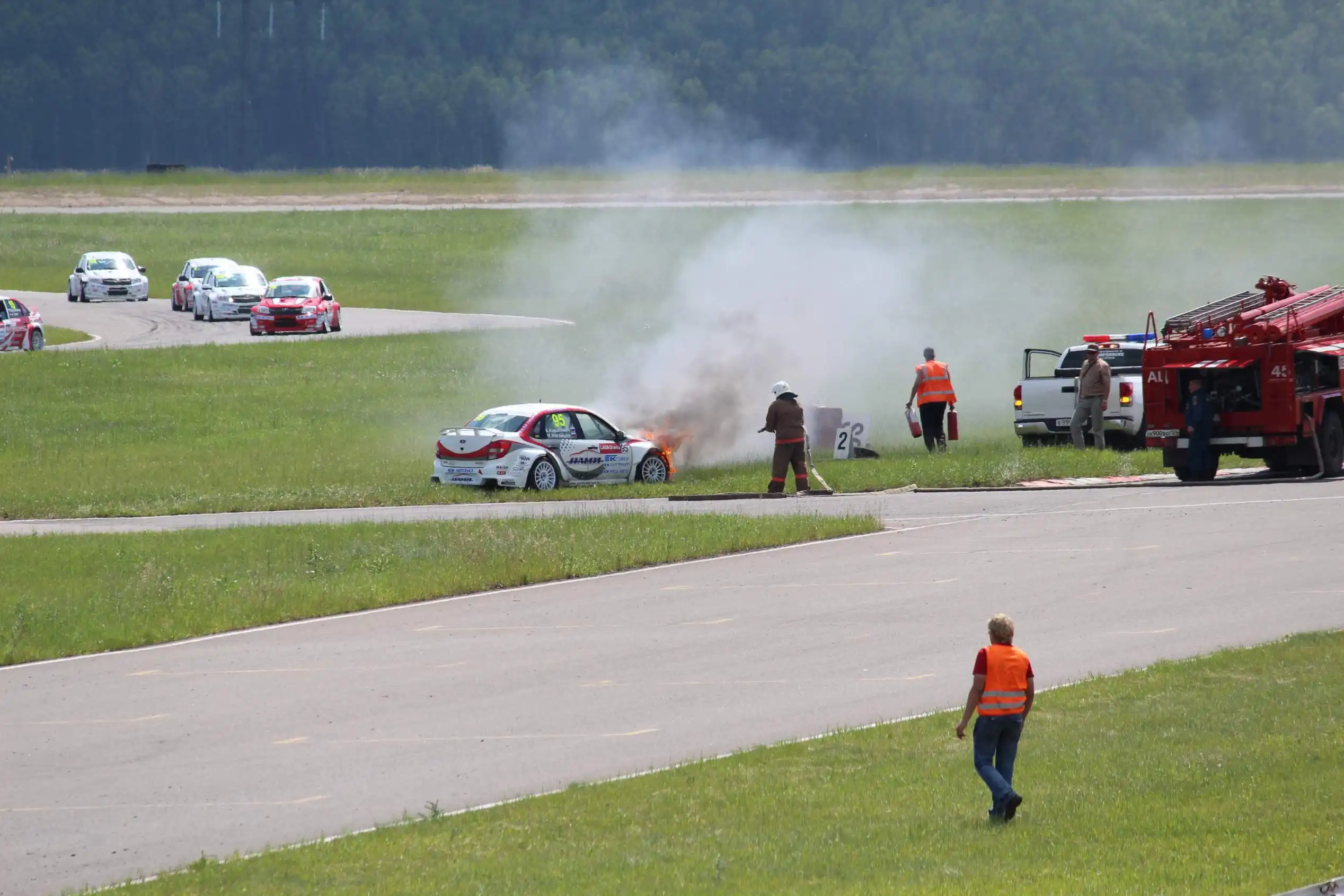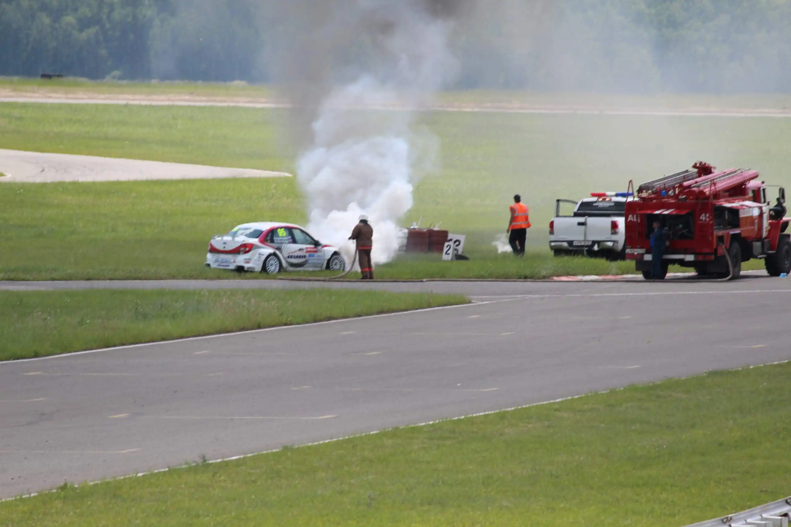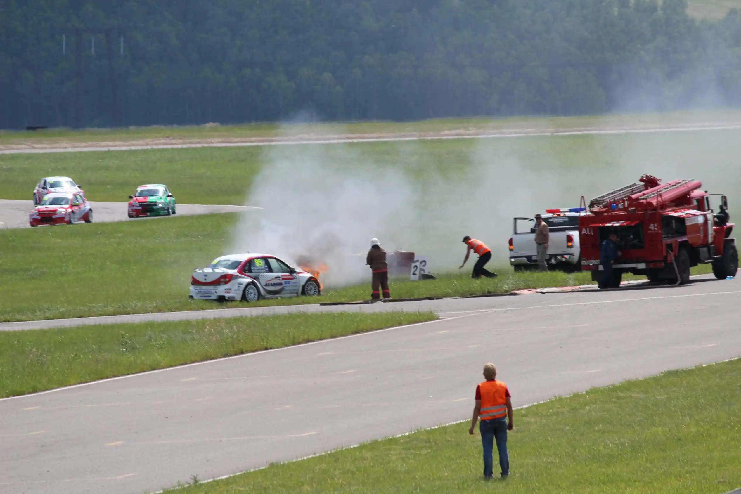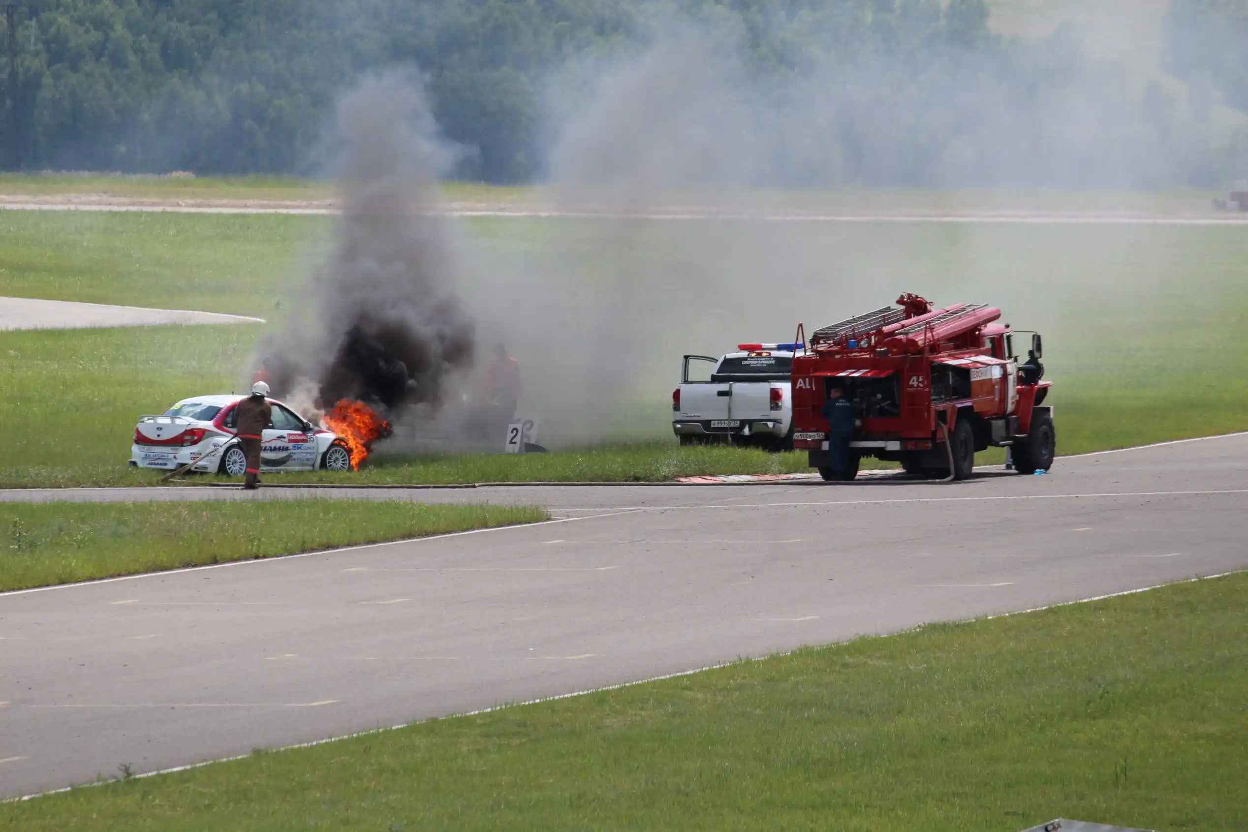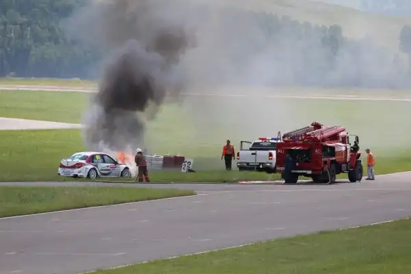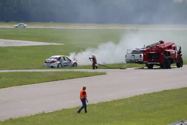 Сделаю спойлер: в этой части Вы увидите два из четырех возгораний спортивных автомобилей. Пожарная служба работала ОЧЕНЬ медленно. Был один пожар в самом дальнем повороте, пожарники ехали туда минут 10-15, и за это время подкапотное простанство машины сгорело полностью.