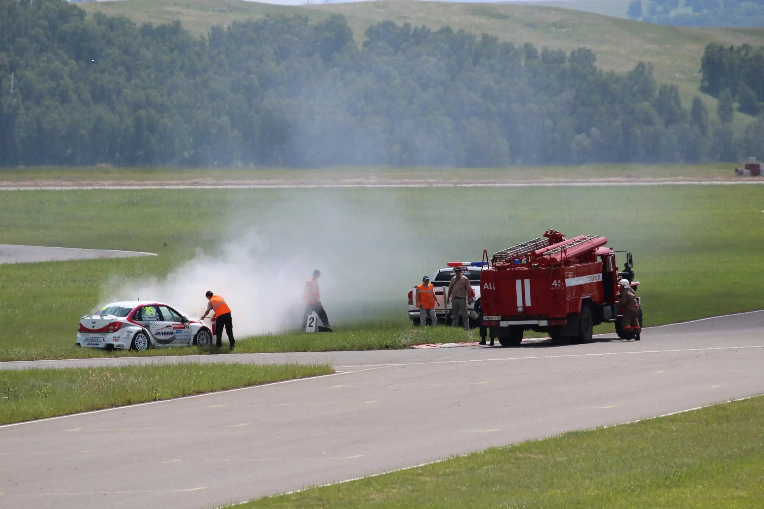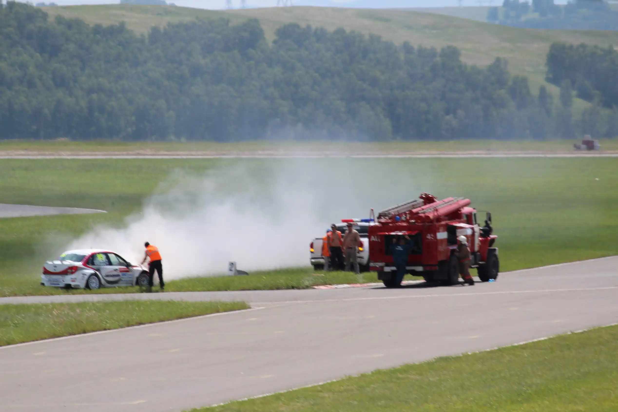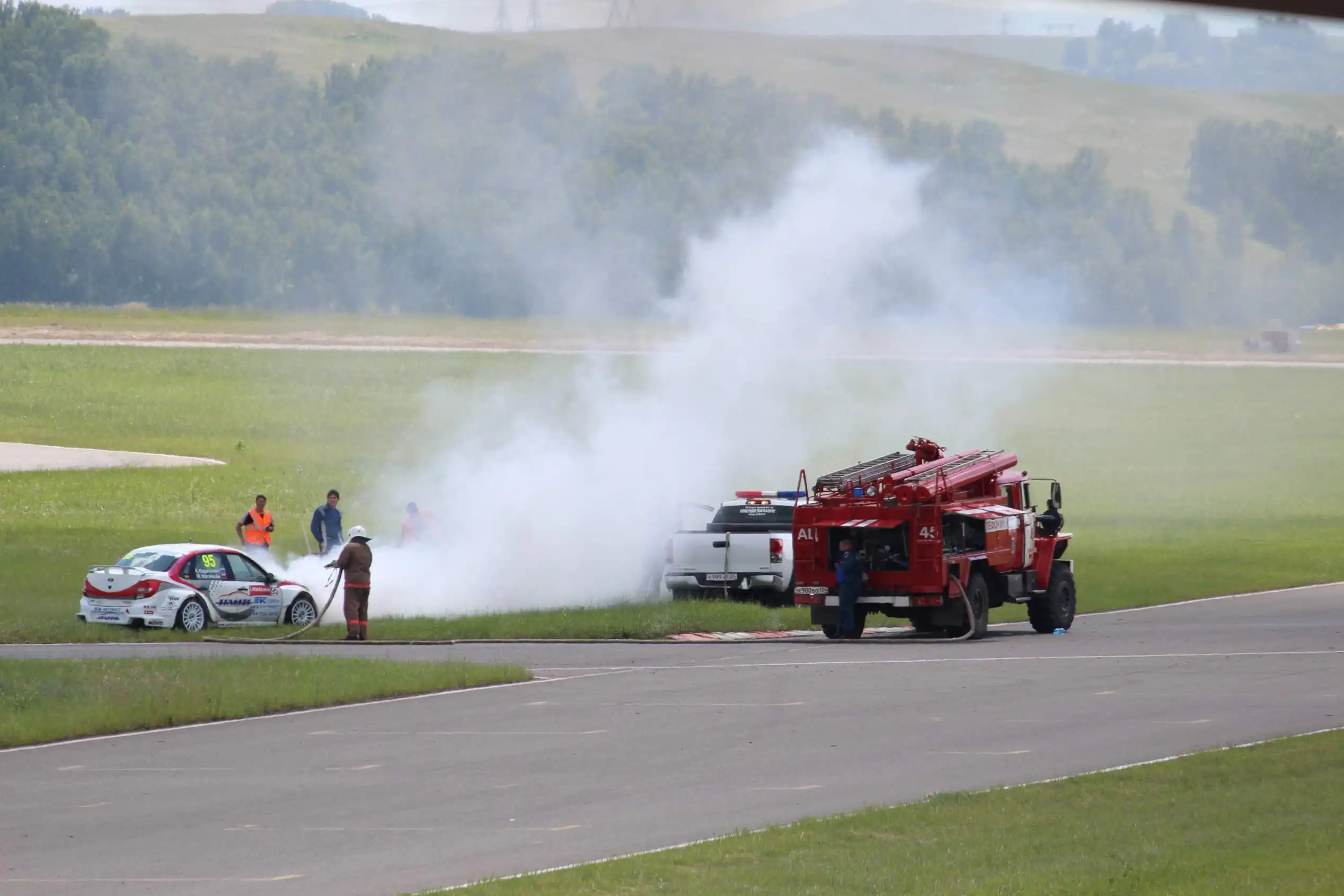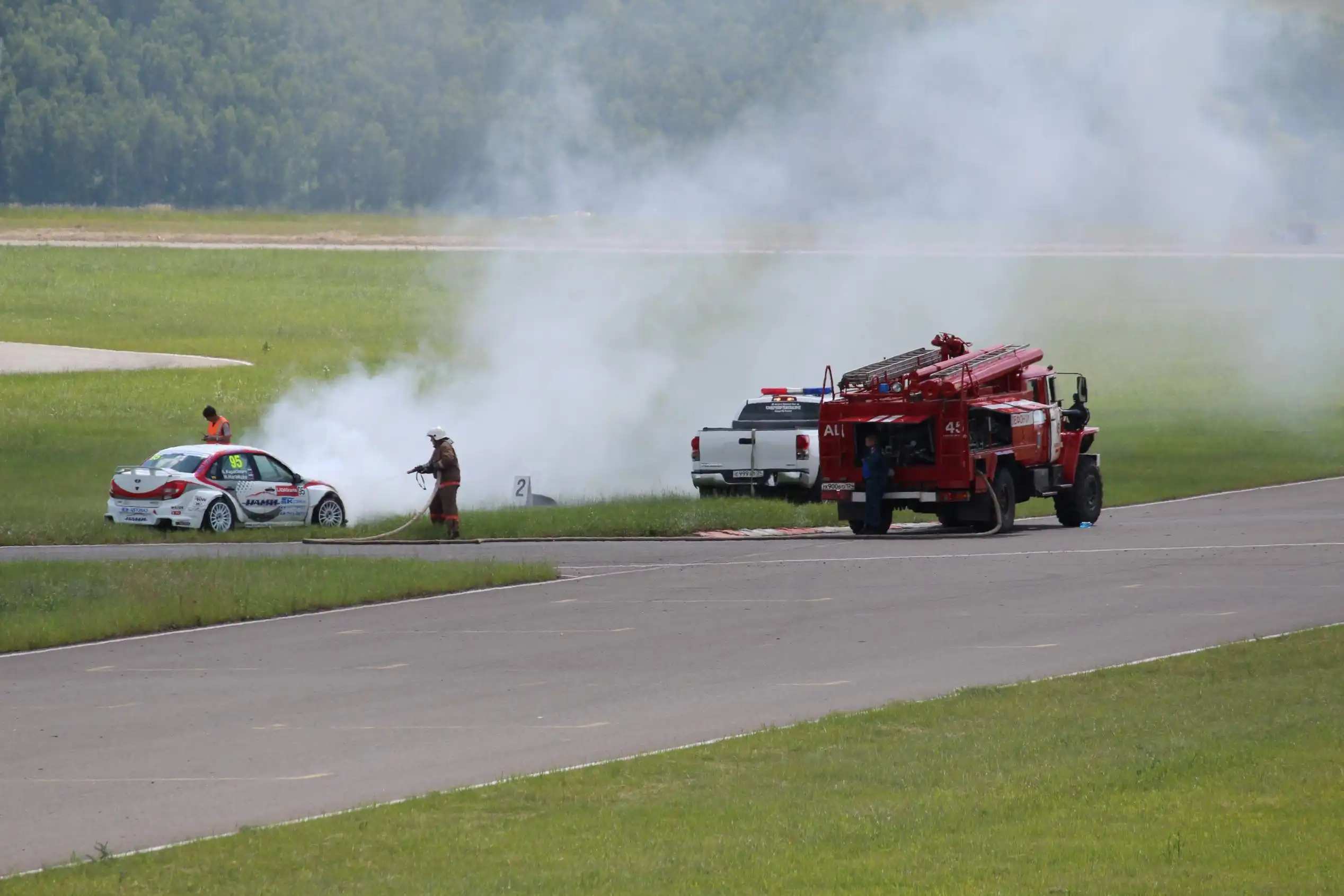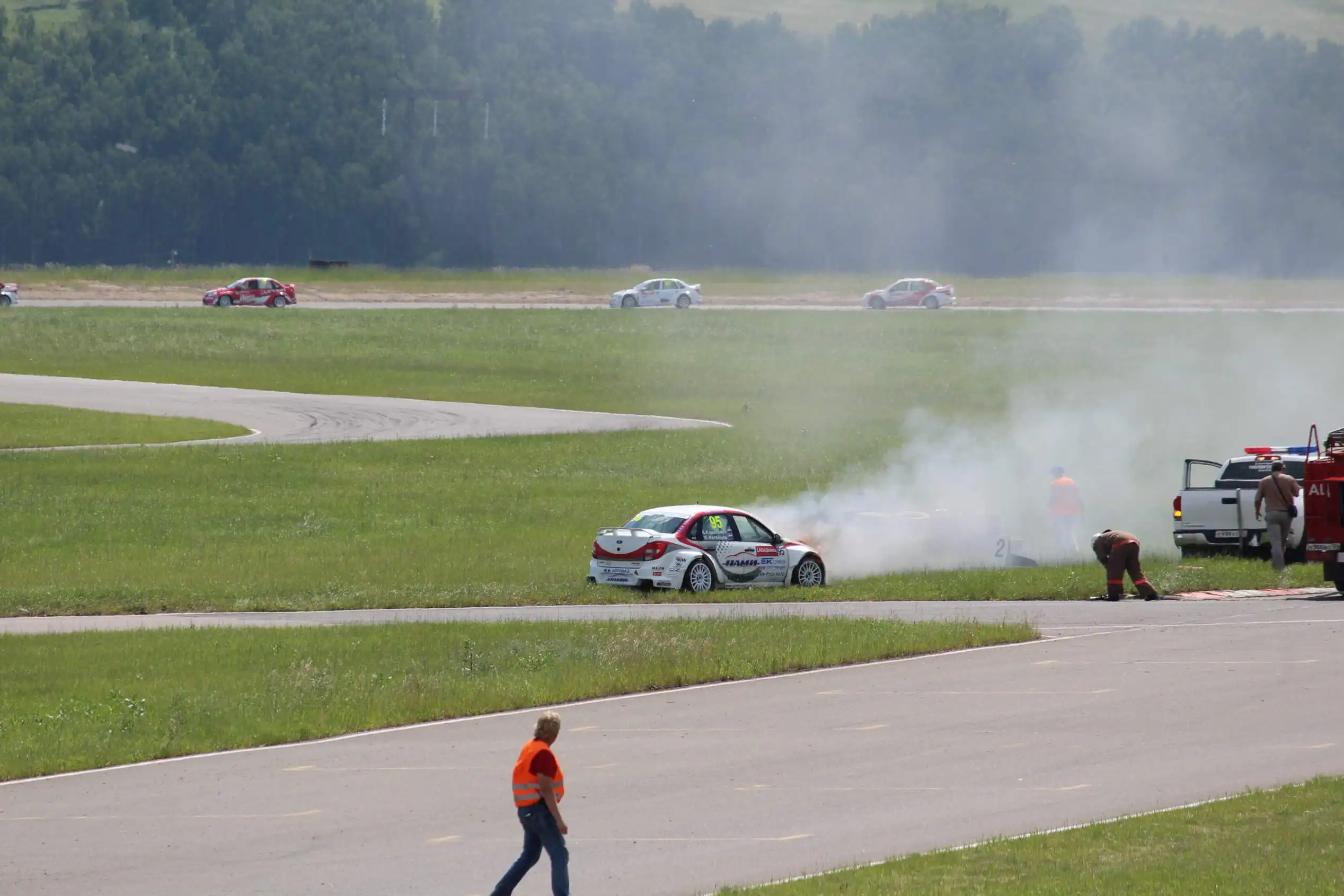 Сделаю спойлер: в этой части Вы увидите два из четырех возгораний спортивных автомобилей. Пожарная служба работала ОЧЕНЬ медленно. Был один пожар в самом дальнем повороте, пожарники ехали туда минут 10-15, и за это время подкапотное простанство машины сгорело полностью.