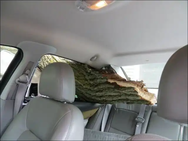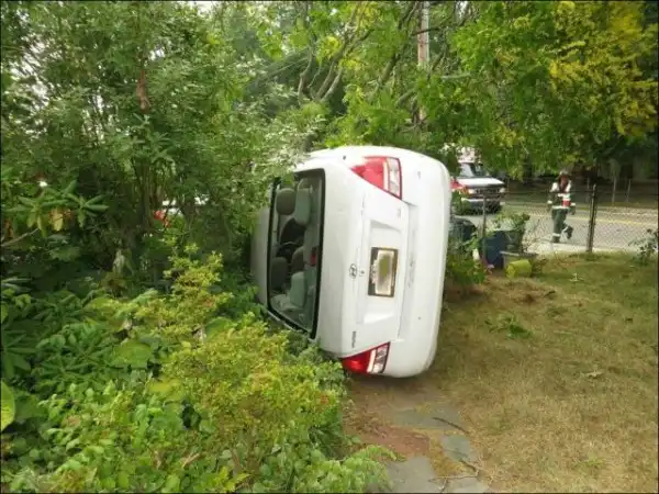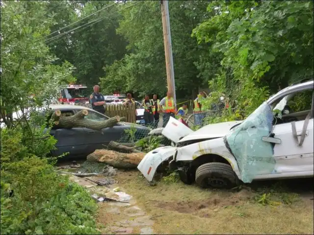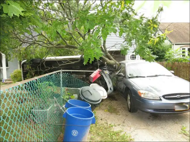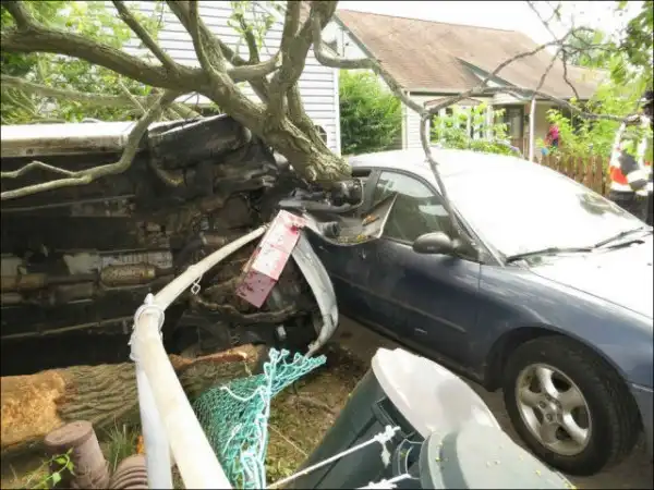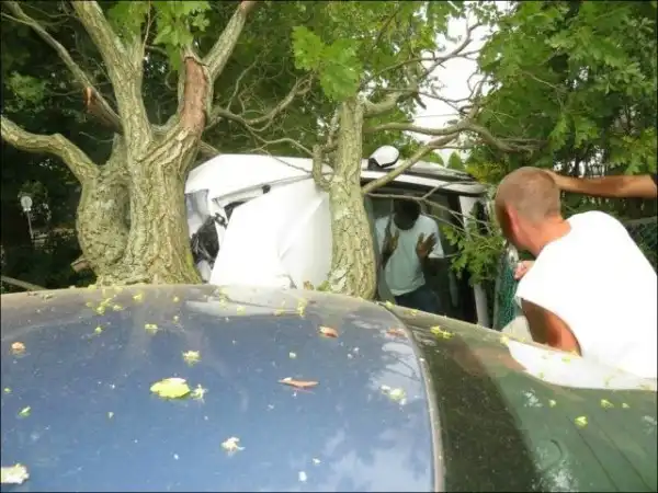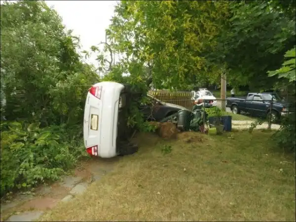 Чтобы избежать аварии этот парень съехал с обочины, протаранил забор, свалил дерево и ударил стоящую во дворе машину.