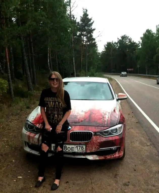 Владелица белоснежного BMW 328 решила преобразить свой автомобиль винилографией. Но рисунок она выбрала очень необычный. Выделиться из серой массы у девушки точно получилось!