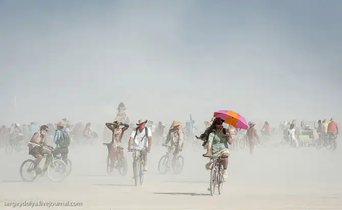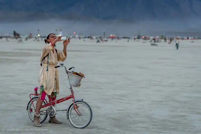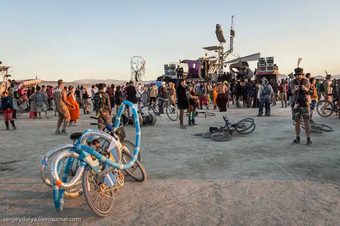 Несмотря на то что большую часть пустыни, где проходит Burning Man, занимают автомобили участников, передвигаться на них строго запрещено. Исключения составляют лишь те машины, над которыми поработали художники и мастера (они, кстати, еще выполняют роль общественного транспорта). Остается только один способ энергичного перемещения по огромной территории – велосипеды.