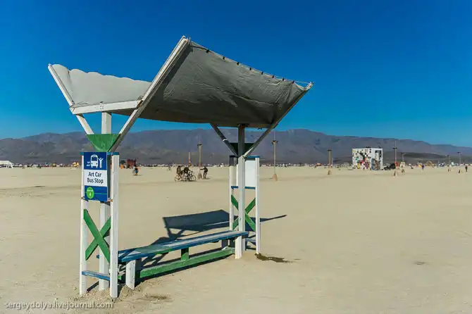 Автобусная остановка для арт-мобилей. По идее, они должны курсировать между ними, но подчас кажется, что маршруты арт-мобилей не укладываются в установленные рамки: