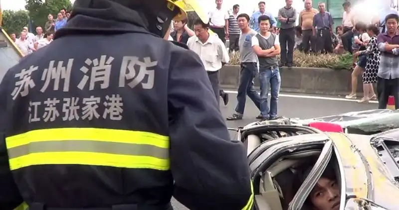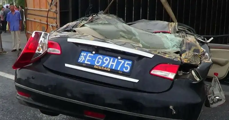Внезапно металлическая емкость сорвалась и упала прямо на машину, превратив ее в блин. Контейнер пришлось поднимать мощным краном. Каково же было удивление, когда спасатели обнаружили, что автолюбительница цела и невредимо. Немного работы сваркой, и дама отправилась в больницу на стандартную проверку.