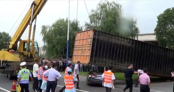 Одна китайская дамочка ехала за рулем своего автомобиля за грузовиком, который перевозил огромный контейнер.