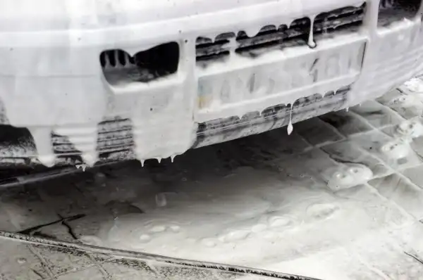 Второй этап — с помощью пеногенератора на автомобиль наносится специальное моющее средство. Оно легко справляется с трудносмываемой грязью. Главное не спешить, смытая раньше времени пена — деньги клиента на ветер.