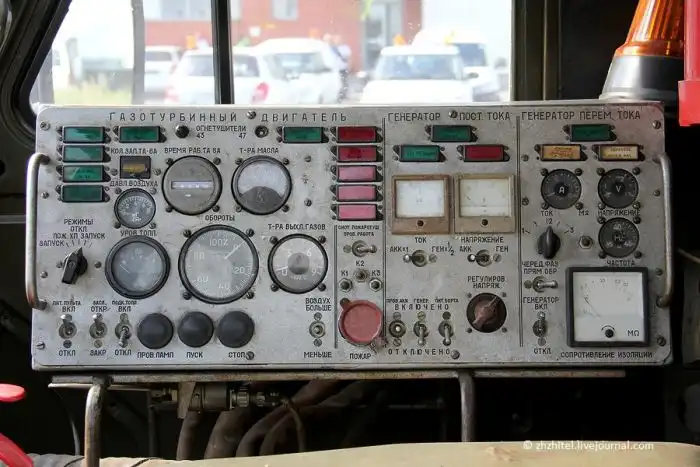 Давайте заглянем в кабину. Справа от водителя вот такая панель управления всем этим хозяйством. Так, немного проясняется, очевидно двигатель может вращать генераторы. Но вряд ли ради того, чтобы сделать передвижную электростанцию городили бы такую сложную конструкцию. Правильно у этого УАЗика кроме выработки электроэнергии есть и более важные задачи.
