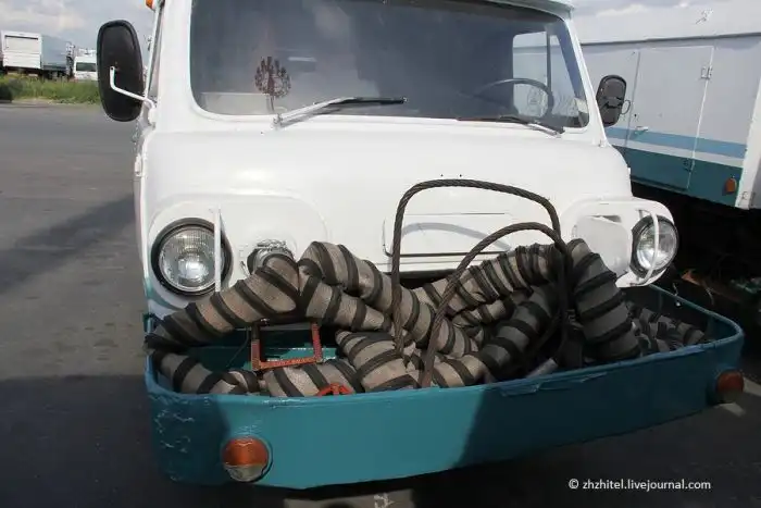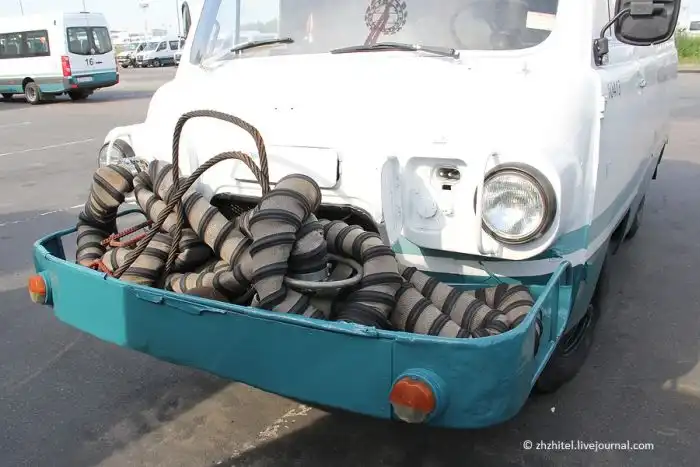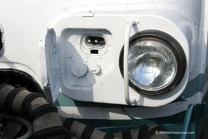 Первое, что бросается в глаза — вынесенный вперед бампер, служащий поддоном для гофрированного шланга, необычные выступы под фарами. Самые внимательные заметят высоко поднятую горловину сразу за правой дверью, хотя ниже есть еще одна, как у всех нормальных УАЗиков.