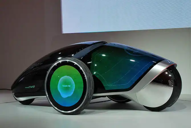 Сразу перейдем к нереально футуристическому концепту транспортного средства будущего, которому дали имя FV2. По словам создателей, транспортное средство будет распознавать настроение водителя и предлагать ему варианты дальнейшего маршрута. На лобовом стекле будет располагаться дополнительный экран взаимодействия с водителем, а цвет авто будет меняться также в зависимости от настроения водителя