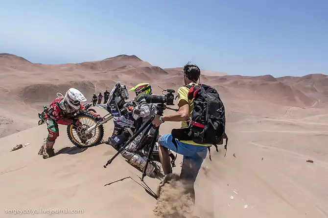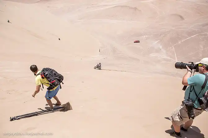 Произошло это, если честно, совершенно случайно. Мы приехали в пустыню заснять гонщиков и забрались на большой зрительский бархан. Напротив находился другой песчаный холм, по нему гонщики должны были спускаться. Прикинув, что получатся хорошие кадры с фонтанами песка, стали ждать. Борис Гадасин (он ехал с нами), сказал, что крутого в этом мало – спускаются и спускаются, что тут такого? Вот если бы мы сняли как они забираются, сваливаются в песках и буксуют – вот был бы достойный кадр. Борис даже пообещал доставить нас до середины бархана на машине, откуда мы дотопаем ножками до вершины. Мы постояли еще какое-то время, чтобы определить где именно проходить спецучасток, потом сели в машину и поехали.