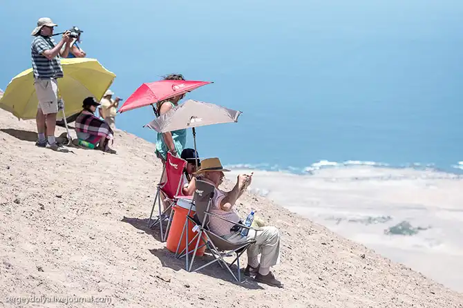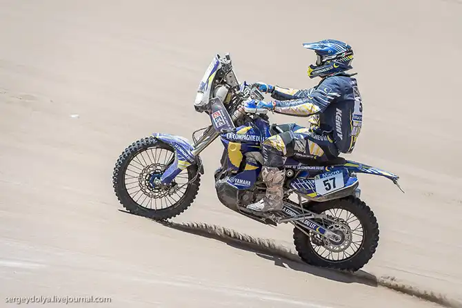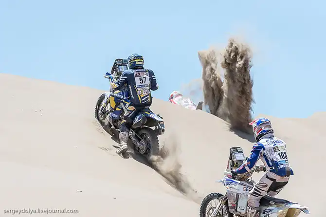 После триумфального появления, нам предстояло долгое восхождение на вершину. Было тяжело: одежда и обувь забилась песком, воду забыли в машине, на мне было две камеры (одна с неподъемным объективом 200-400 мм) и в какой-то момент я подумал бросить все к чертовой матери и съехать вниз. Собрав волю в кулак, мы добрались-таки до вершины и сели в ожидании. Вскоре показалась стайка мотоциклистов: почти все из них забрались и с легкостью перемахнули через гребешок, но один застрял. И тут мы нарушили третье правило – помогли гонщику…