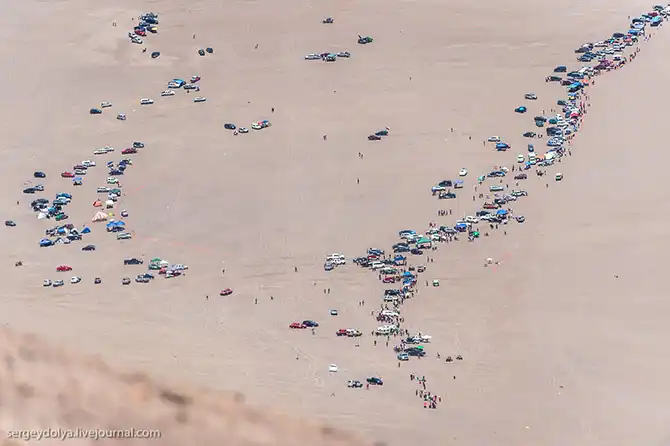 Очень тяжело. Леша в кроксах едва не обжог о раскаленный песок ноги. На фото сложно передать высоту бархана, посмотрите на машинки внизу, чтобы представить масштаб: