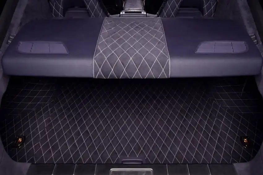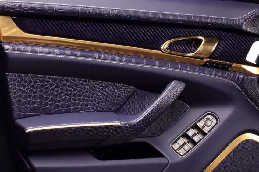 Салон обшит крокодиловой кожей фиолетового цвета, в тон которой в фиолетовом оттенке также выполнены карбоновые вставки, алькантара на потолке со стойками и перфорированная кожа, которой обтянута центральная часть сидений. Для яркого контраста также используются золотистые акценты и белые контуры сидений и напольных ковриков.