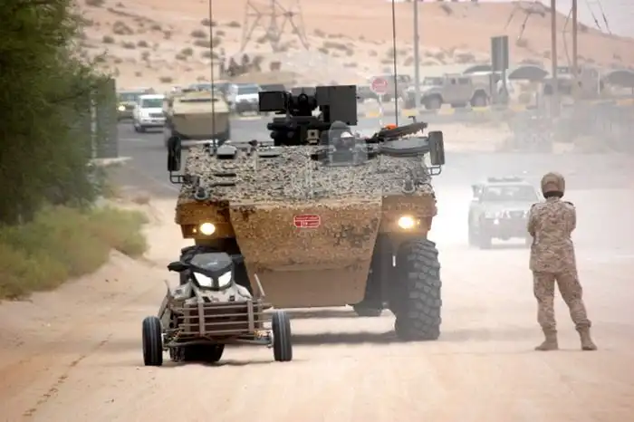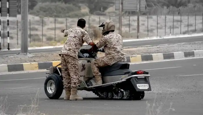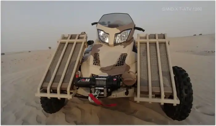 Интересную модель вездехода для армейских нужд представила американская компания. Полугусеничный вездеход имеет шины низкого давления спереди и широкую гусеницу сзади, что позволяет показывать невероятную проходимость по таким сложным покрытиям как песок, рыхлый снег и непролазная грязь. Гусеница сделана из композитного кевлара и практически неубиваема, даже не боится длительного контакта с песком в подвижных частях.