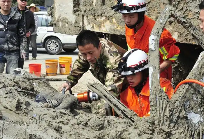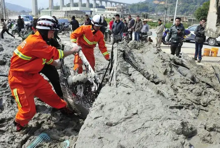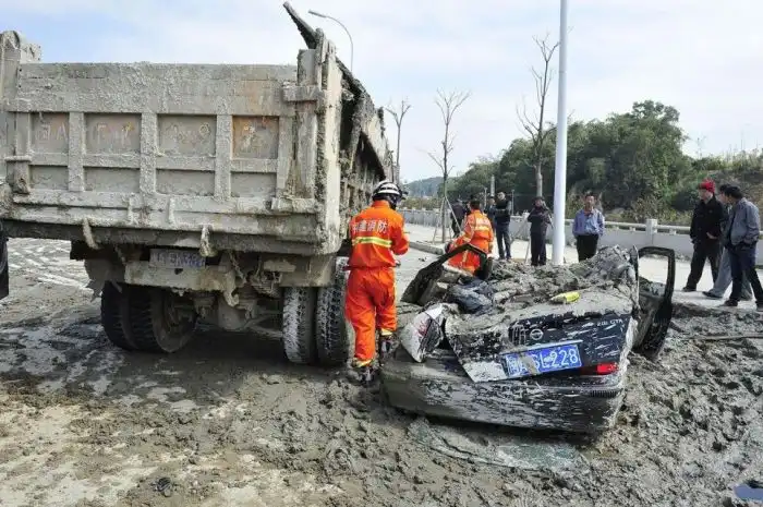 Несчастный случай произошел в Китае, где девушка, разворачиваясь на автомагистрали, забыла посмотреть в зеркало заднего вида. В результате чего, грузовик, перевозивший 10 тонн бетона, не успел вовремя остановиться и врезался в автомобиль. Китаянка оставалась в бетонном плену на протяжении 40 минут, после чего спасателям удалось её достать. Удивительно, но девушка отделалась лишь незначительными травмами.
