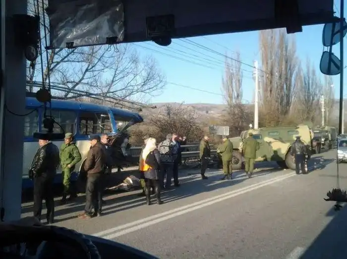 Довольно необычное ДТП произошло в Крыму недалеко от поселка Перевальное. Там российский военный бронеавтомобиль "Тигр" врезался в стоящий на остановке троллейбус, превратив его просто в груду металлолома. Официальной информации о количестве пострадавших в этой аварии пока нет, но по словам очевидцев, пострадавшие были и в троллейбусе, и в "Тигре".