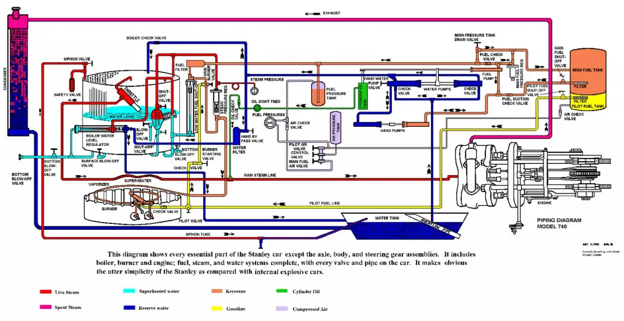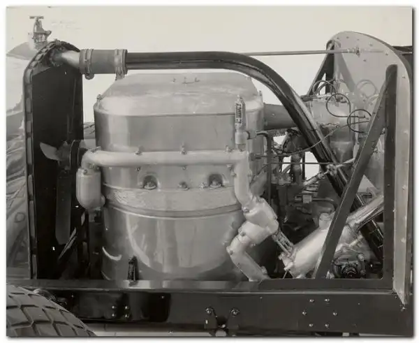 Система работала так: керосин под давлением проходил через карбюратор-горелку, богатая горючим смесь при высокой температуре поджигалась запальной свечой – точно так же, как в двигателе внутреннего сгорания. Многопластинчатый ротационный компрессор с электроприводом подавал воздух и задувал подожженную смесь в камеру сгорания. Там поддерживалось устойчивое горение, нагревался паровой котел и вырабатывался пар. Весь процесс запускался с одного выключателя на приборной доске. Впервые возник паровой автомобиль, который заводился так же просто, как бензиновый. После запуска, разумеется, все равно приходилось ждать, пока котел не прогреется и не поднимется нужное давление, но теперь для «разведения паров» требовалось менее 90 секунд. После того как машина трогалась, в действие вступало другое автоматическое устройство, которое поддерживало необходимое давление пара – для этого в зависимости от характера дороги и необходимой скорости в топке периодически заново разжигалось пламя.