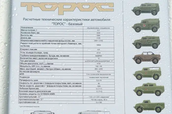 На выставке во Всероссийском музее декоративно-прикладного и народного искусства были показаны пять машин-прототипов: три варианта «Тороса» (базовый, командирский и санитарный) и две версии «Колуна» (шестиколесная с десантным отделением и четырехколесная без). Все пять машин являются упрощенными прототипами. На них используются компоненты силовой установки и ходовой части, которые планируется устанавливать на серийную технику. Одновременно с этим машины оснащены корпусами из неброневой стали. Пять машин предназначены для проверки некоторых технических решений, а также для демонстрации проекта потенциальным покупателям.